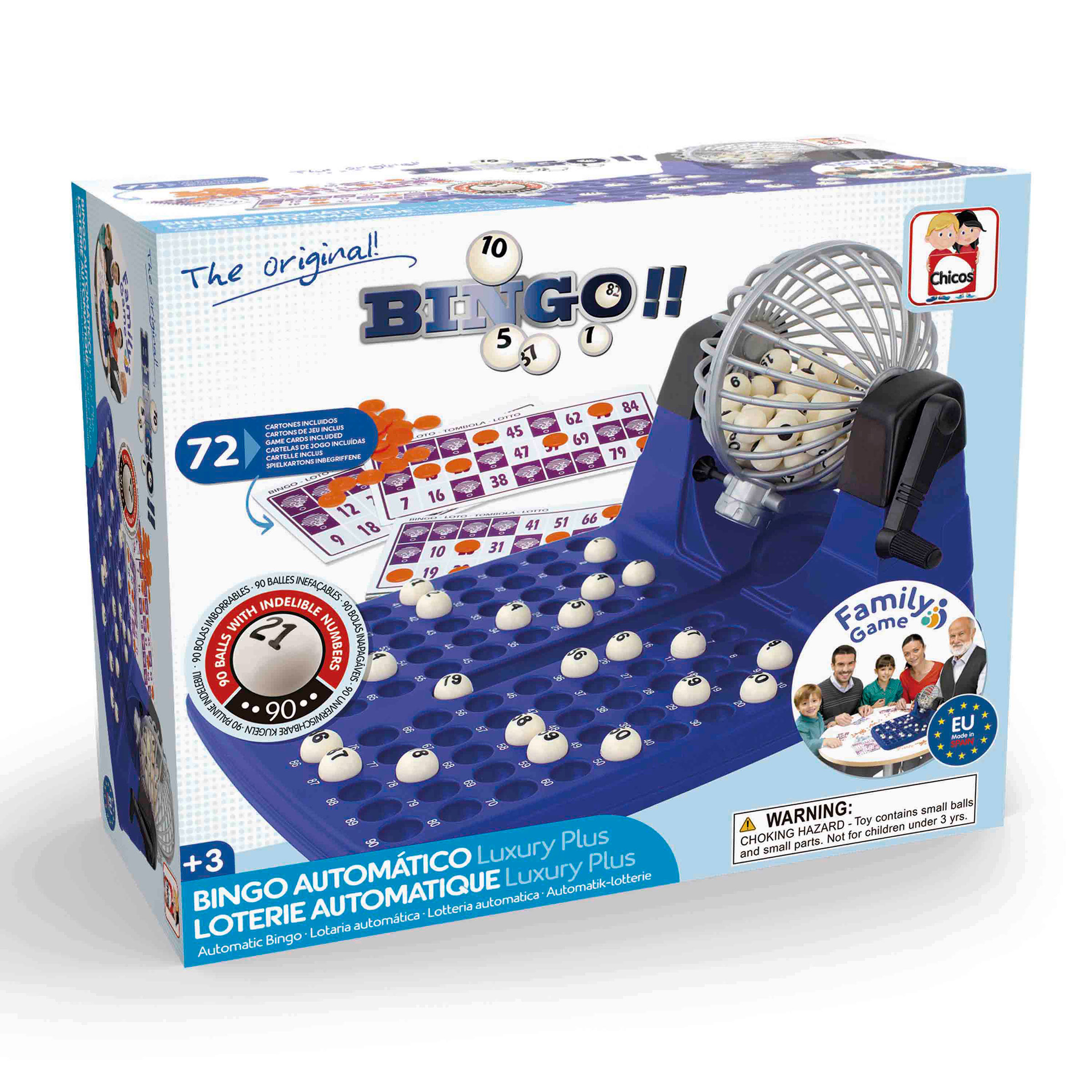 Con la Lotería Automática Lujo Plus las tardes de entretenimiento en familia ya están completas. Siente la emoción de ese momento mágico en que aparece el número que te falta y puedes cantar línea o bingo. Coloca las bolitas en sus espacios y aguarda a que te sonría la fortuna. Incluye 72 cartones y fichas de juego. La numeración indeleble de las 90 bolas está especialmente tratada para que no se borren con el uso continuado.