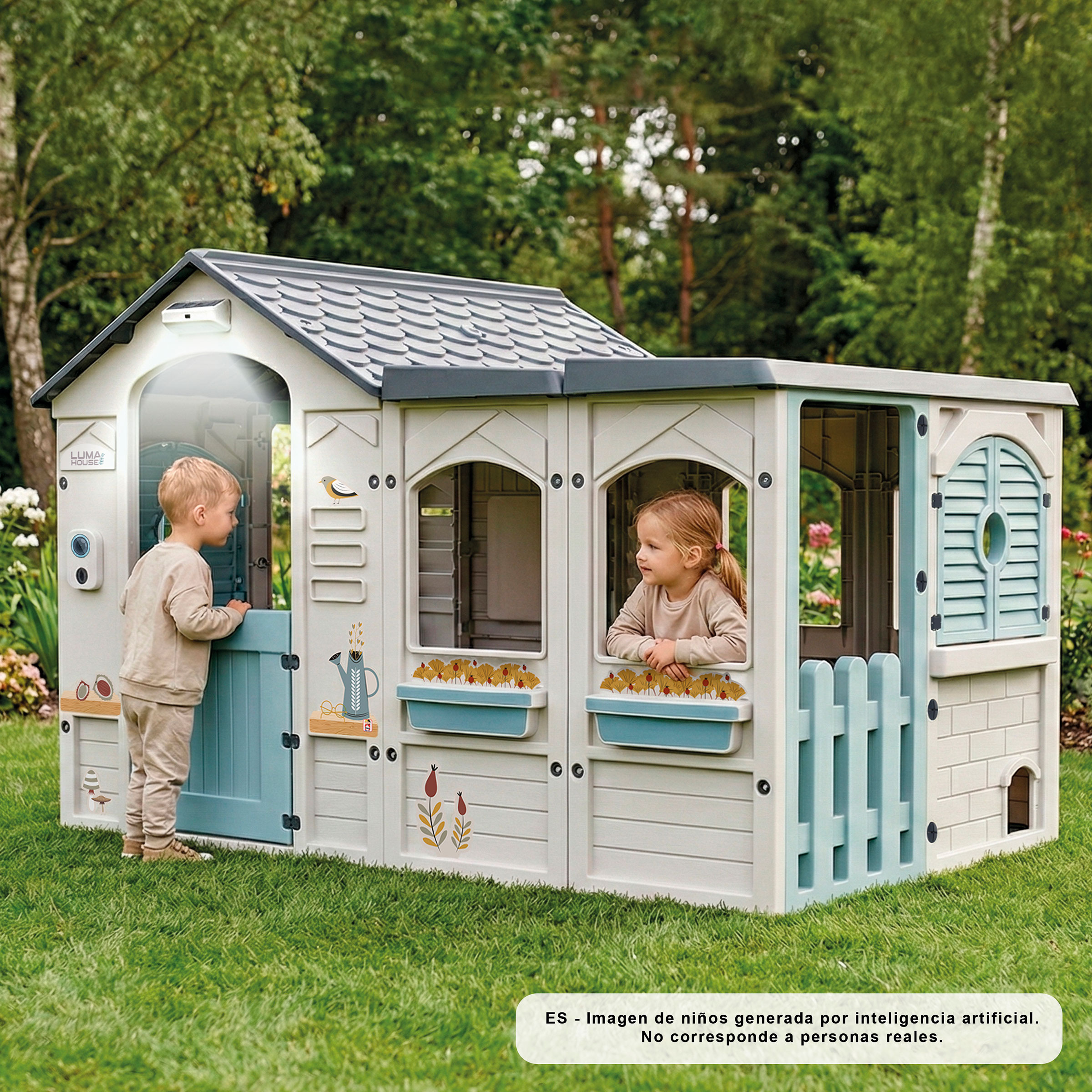 Gran Casita Luma House para niños y niñas a partir de 24 meses. La casita ofrece un gran espacio de juego para inventar y crear divertidas historias con todos tus amigos. La Casita Luma House equipada con luz y sonido, tiene ventanas abatibles, buzón para cartas, una gatera para que las mascotas también puedan ser invitadas y adhesivos para que puedas decorarla cómo más te guste. La Casita es de muy fácil montaje gracias a sus piezas “click-clack”
