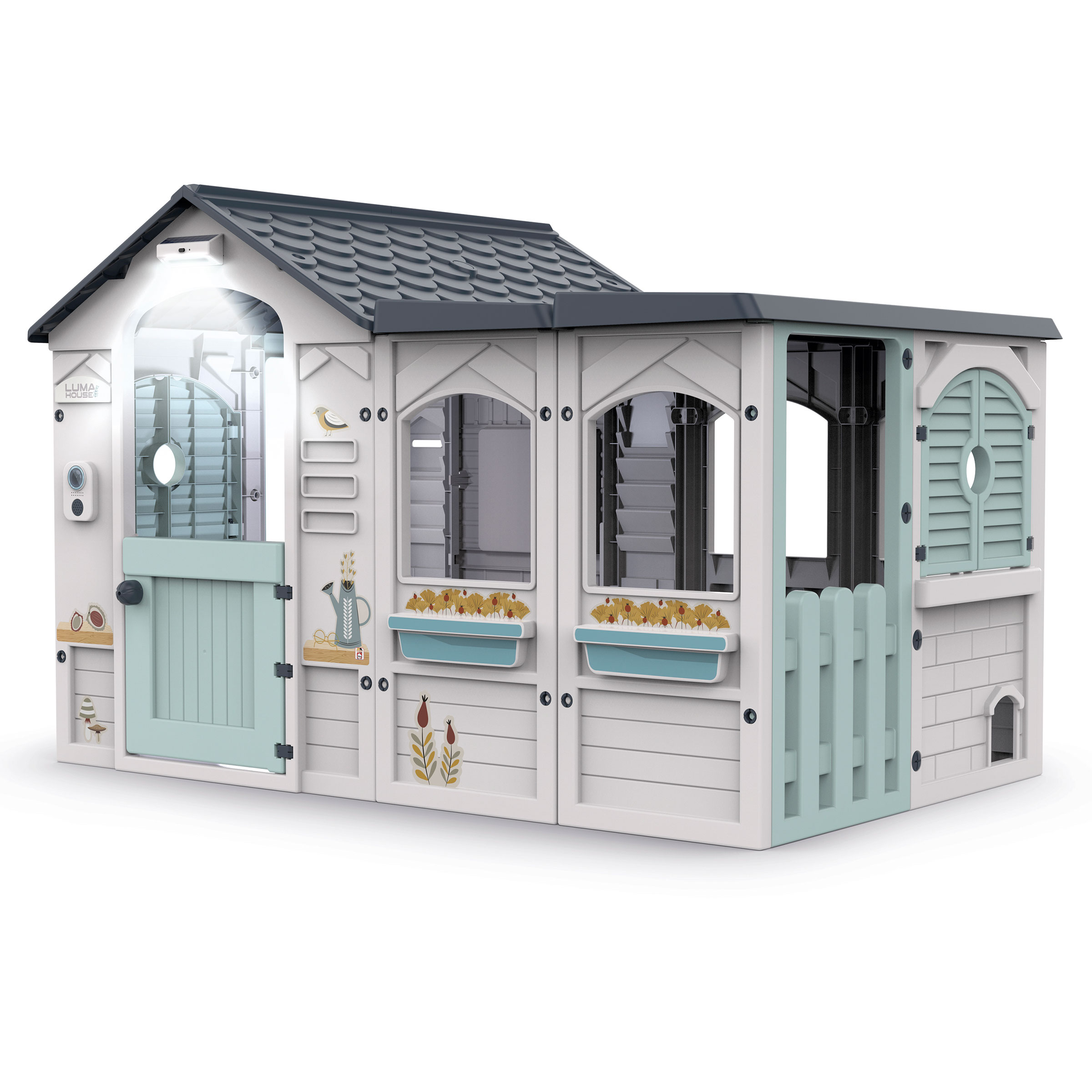 La Casita Luma House equipada con luz y sonido, tiene ventanas abatibles, buzón para cartas, una gatera para que las mascotas también puedan ser invitadas y adhesivos para que puedas decorarla cómo más te guste.
